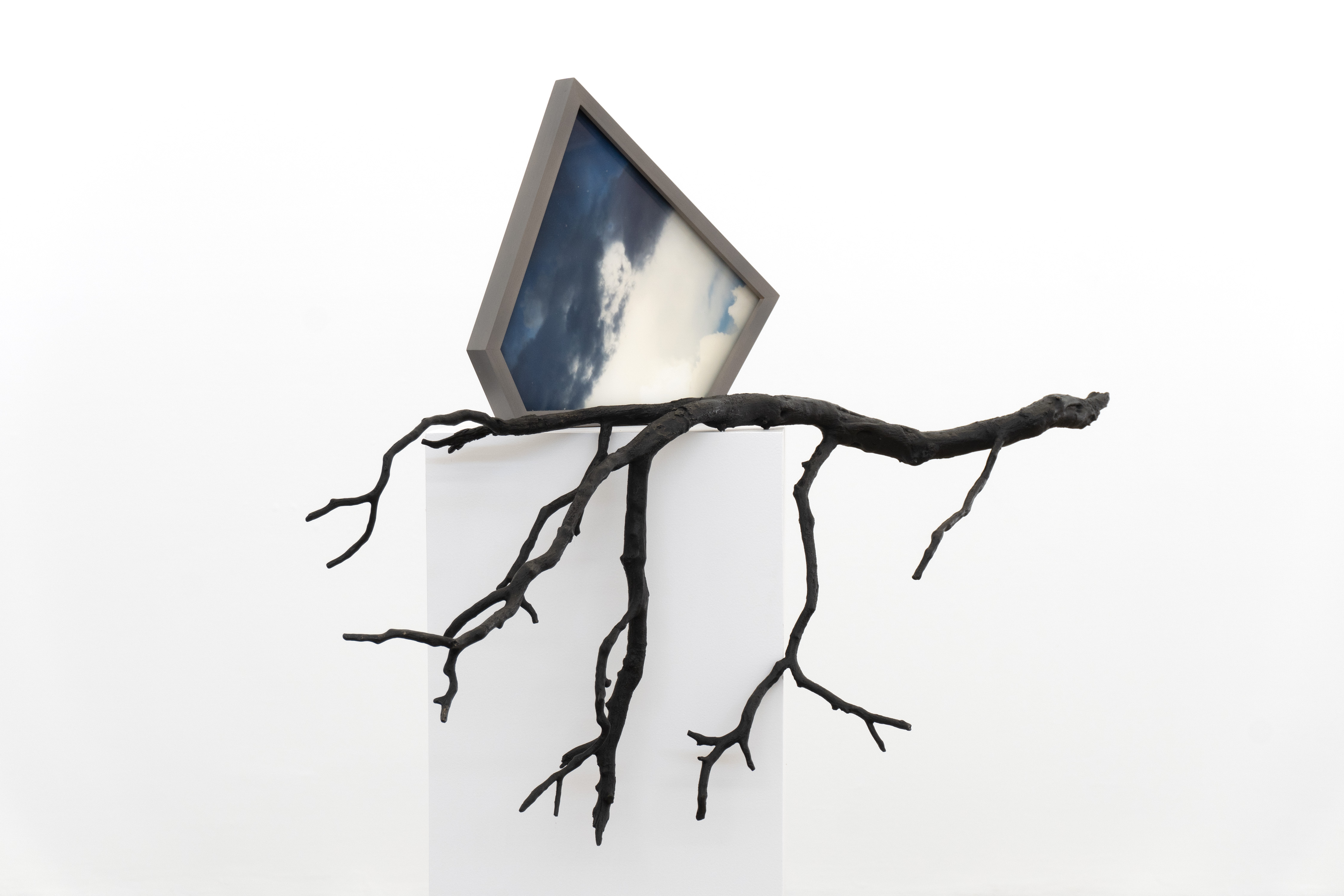 While walking in a vast landscape the artist tripped and fell multiple times. The cause of each stumble was a series of dead manzanita branches scattered across the landscape. From these branches bronze casts were made, becoming an archive of each of these unexpected moments. For this work each of these sculptures is paired with two photographs that depict cloud formations; one that is original, and one that is a mirrored copy. Together the works become a tribute to the struggle to truly be ‘in the moment’; a symbol of the multifaceted nature of a singular perspective and how complicated it is to articulate and translate the nature of a given experience.